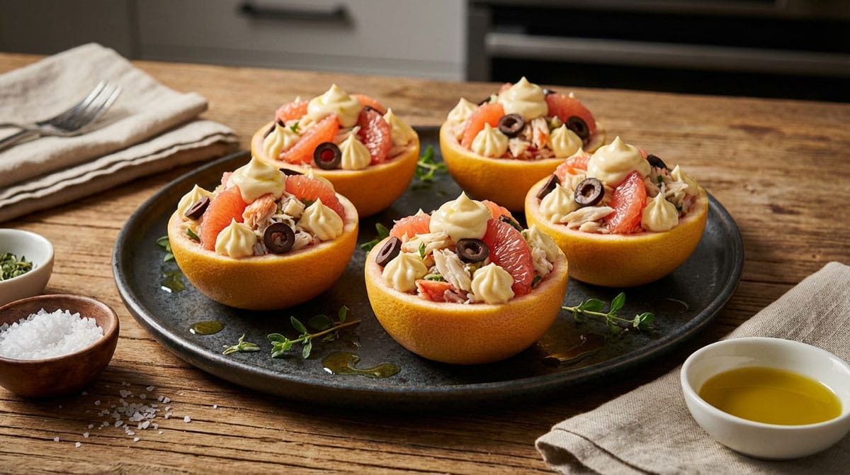 Vous savez ce que j'adore dans la cuisine ? Ces mariages inattendus qui deviennent des évidences dès la première bouchée… Le pamplemousse au crabe, c'est exactement ça ! Une entrée rafraîchissante qui allie la douceur sucrée et légèrement amère de l'agrume à la chair délicate du crustacé. J'ai découvert cette recette pamplemousse crabe il y a quelques années lors d'un déjeuner dominical, et depuis, elle trône fièrement dans mon répertoire des entrées élégantes… Vous imaginez ? Des demi-coques de pamplemousses farcis garnis de chair de crabe, liés d'une mayonnaise maison onctueuse, parsemés d'olives noires brillantes. C'est frais, c'est joli, c'est terriblement bon ! Cette salade crabe pamplemousse se prépare en un tournemain (bon, il faut quand même monter sa mayonnaise…) et fait toujours son petit effet sur la table. Que vous la présentiez en pamplemousses farcis au crabe ou en verrines pamplemousse crabe pour une version plus moderne, le résultat reste bluffant. Parfois, j'enrichis cette recette crabe pamplemousse avec quelques lamelles d'avocat pour apporter encore plus de douceur… La salade pamplemousse avocat crabe devient alors un vrai festival de textures !